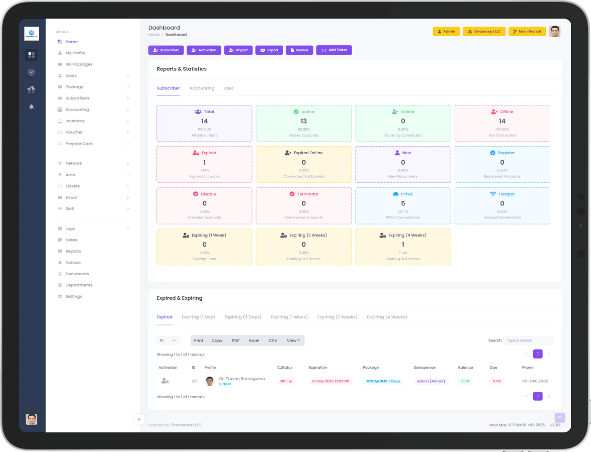 XIM ISP CRM lets you create and manage unlimited branches under each ISP. Every branch works independently with full control over users, roles, packages, subscribers, and accounting. This ensures flexibility while keeping operations streamlined.